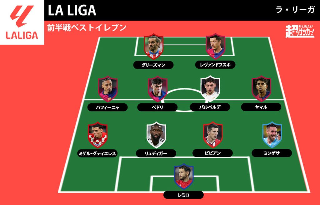 【2024-25 ラ・リーガ前半戦ベストイレブン】3つ巴の争いも3位のバルサから最多4選手を選出