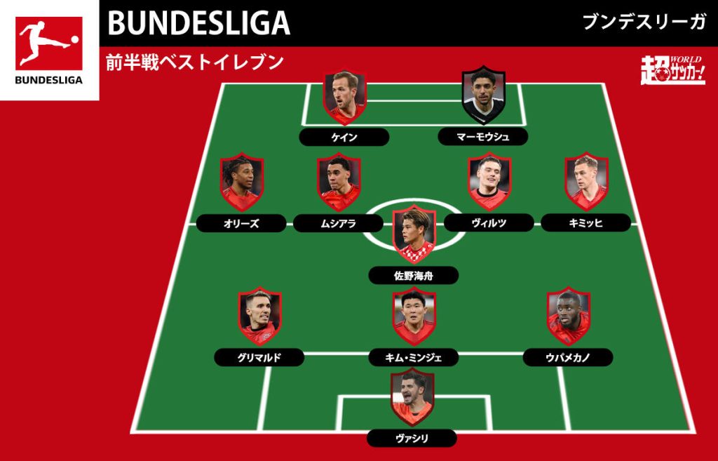 【2024-25ブンデス前半戦ベストイレブン】バイエルンから最多6選手、佐野海舟を選出