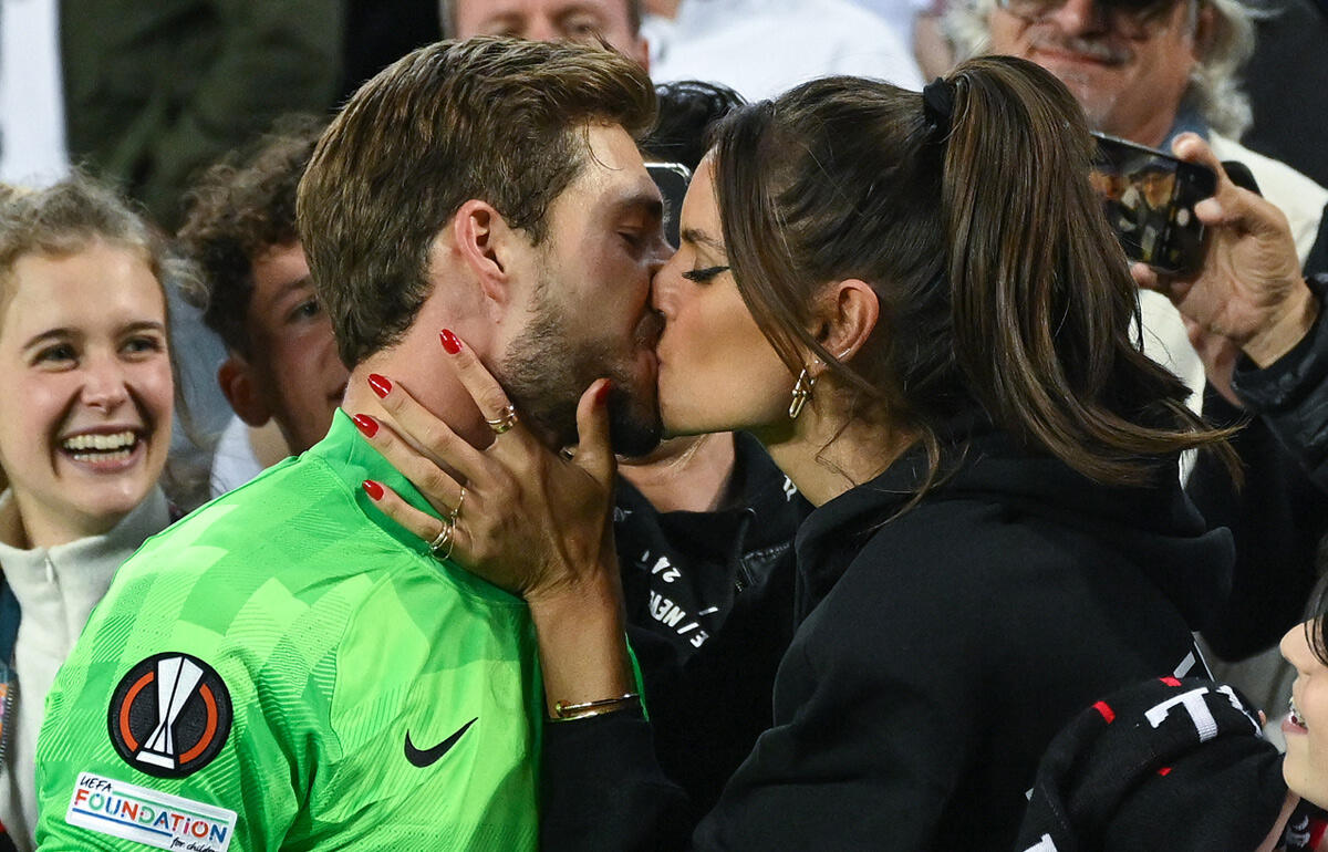 「美男美女すぎる」バルサ撃破のフランクフルト守護神、スーパーモデル妻と“熱烈キス”「本物の愛だ」