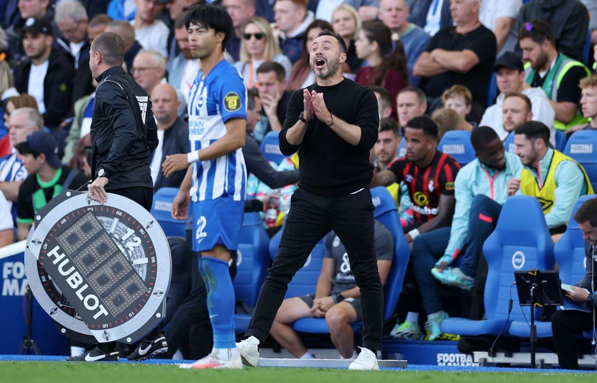 ブライトン&ホーヴ・アルビオンのロベルト・デ・ゼルビ監督のリアクションが話題になっている。24日、プレミアリーグ第6節でボーンマスをホームに迎えたブライトン。ヨーロッパリーグ(EL)明けということもあり9人先発を入れ替えたが、前半は苦戦。先制を許すと、アディショナルタイムに何とか同点に追いついたものの1-1で前半を終えた。