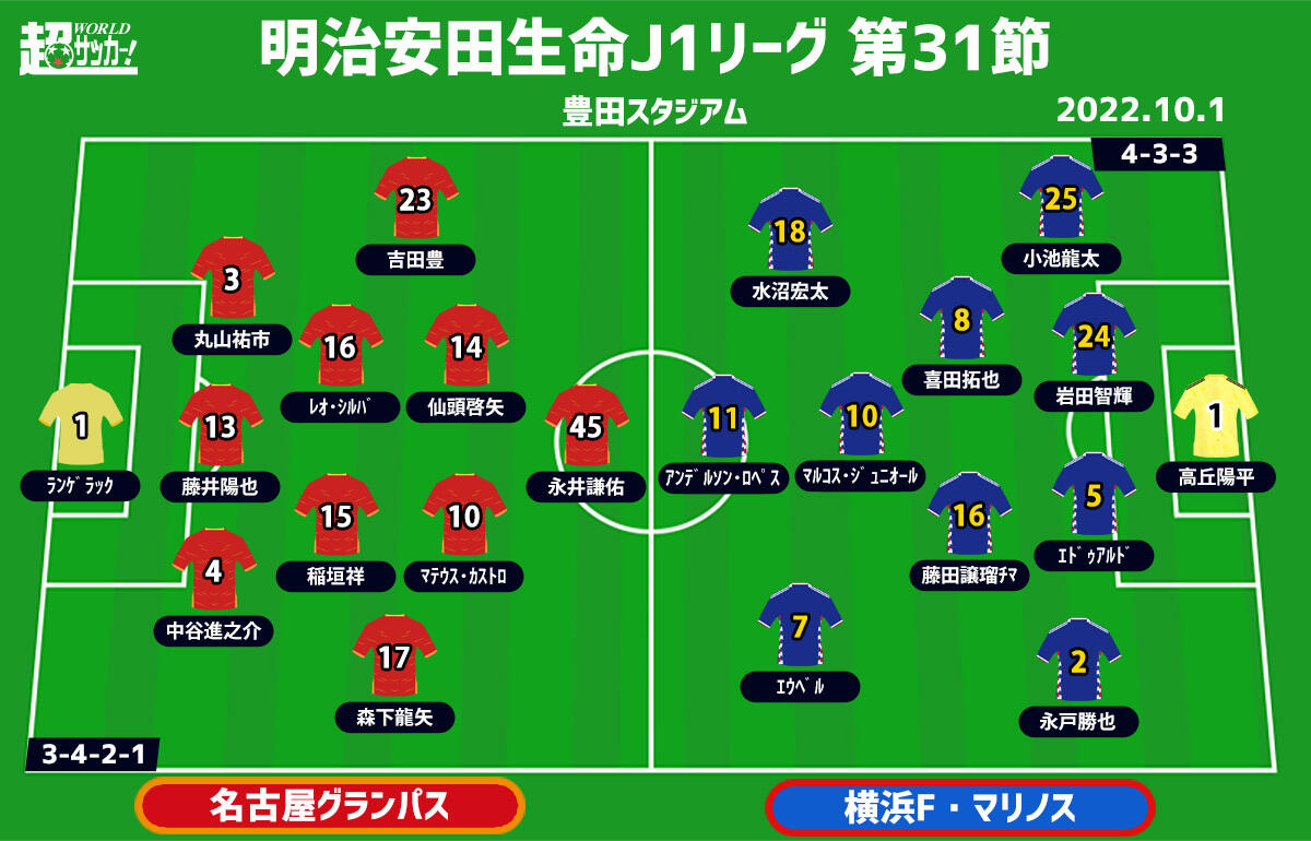 【J1注目プレビュー|第31節:名古屋vs横浜FM】優勝への道を歩み続ける横浜FM、名古屋は上位3連戦の締めくくり