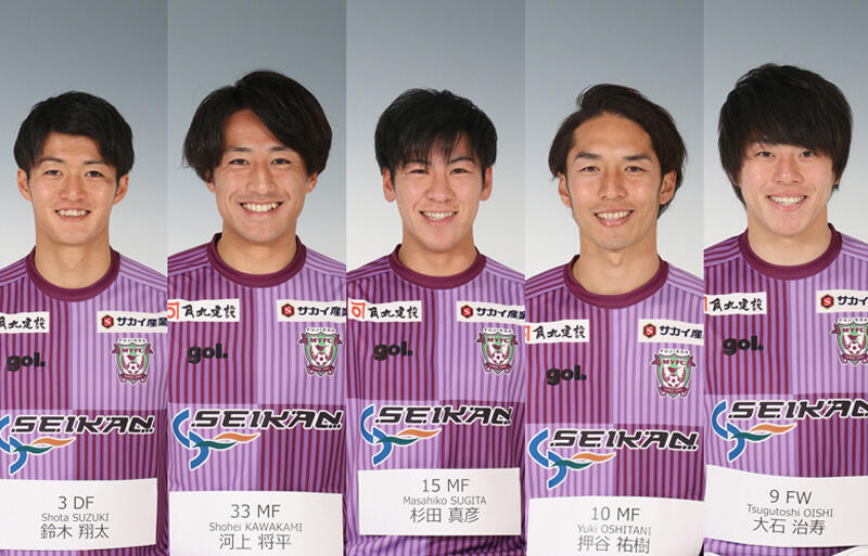 今回発表されたのは、DF鈴木翔太(26)、MF河上将平(24)、MF杉田真彦(26)、FW押谷祐樹(32)、FW大石治寿(32)の5名。