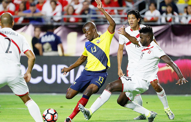 ▽2点を先行されたエクアドルは、ペルーがやや圧力を弱めたこともあり相手陣内でのプレーを続ける。しかし球際を素早く詰めてくるペルーの守備の前に効果的な崩しができない。逆に23分にはセットプレーからレボレドにあわや3点目をいうヘディングシュートを放たれるなど苦しい時間が続く。それでも39分にバレンシアの浮き球のクロスを、E・バレンシアがボックス内でトラップしてシュート。これがゴールネットを揺らして、エクアドルが1点差に詰めて試合を折り返した。