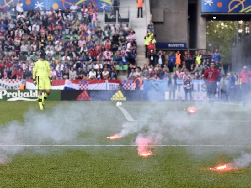 すると終了間際、予期せぬ出来事が起きる。クロアチアのサポーターが発煙筒や爆竹を投下し、試合が中断されてしまったのだ。