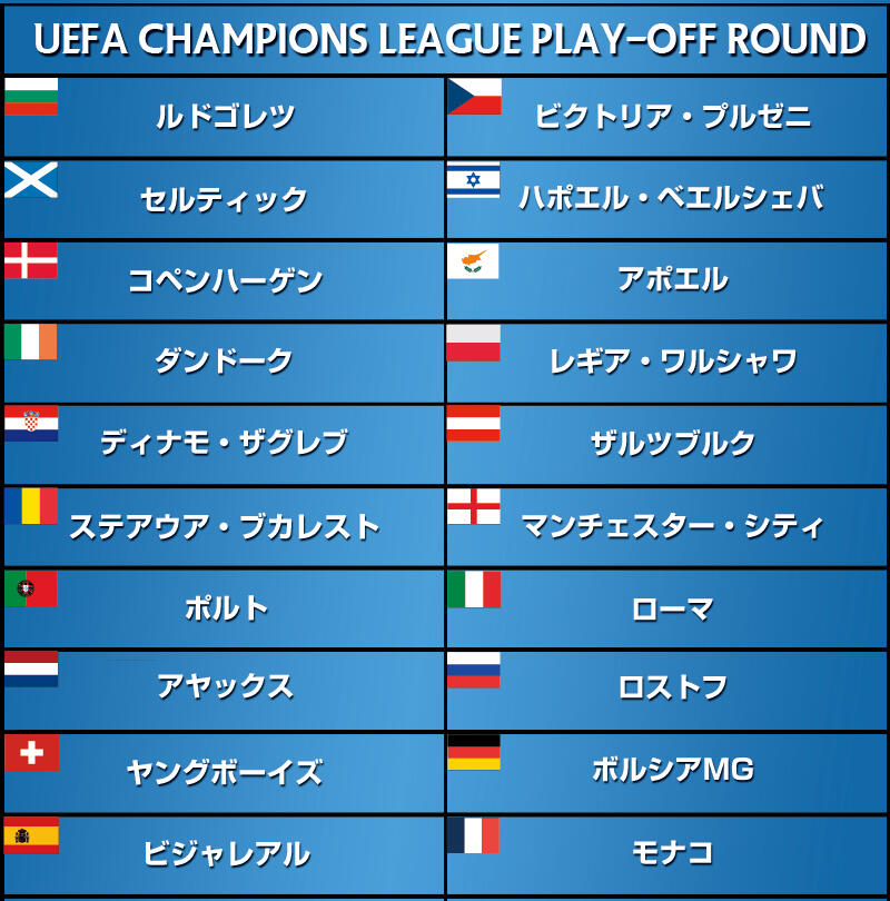 ▽スコットランド王者のセルティックは、イスラエルのハポエル・ベエルシェバと対戦。ロジャーズ新監督に加え、DFコロ・トゥーレやFWムサ・デンベレ、MFパトリック・ロバーツら期待の若手のプレーに注目だ。また、アイルランド勢初の本選出場を狙うダンドークは、ユーロ2016のアイルランドや英国勢、アイスランドのようなサプライズを提供できるか。