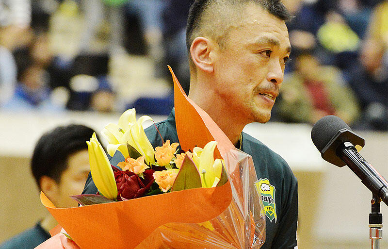 「僕のプロサッカー選手としてのキャリアのスタートは、隣のユニバー競技場でJリーグデビューをさせていただきました。フットサルに転向をして初めてフットサルシューズを履いてプレーしたのは、ここグリーンアリーナでした。ガンから復帰後プレーしたのもここグリーンアリーナ。そして今日、最終戦を迎えたのもグリーンアリーナです。ぼくにとってはここが聖地です。ここから始まり、ここでリスタートし、そして最後を迎えられました。たくさんの方々のご協力、支え、声援、皆様の力があったからこそ今の僕がいます。最後になりましたが、本当に長い現役生活を支えていただき、応援していただき本当にありがとうございました」