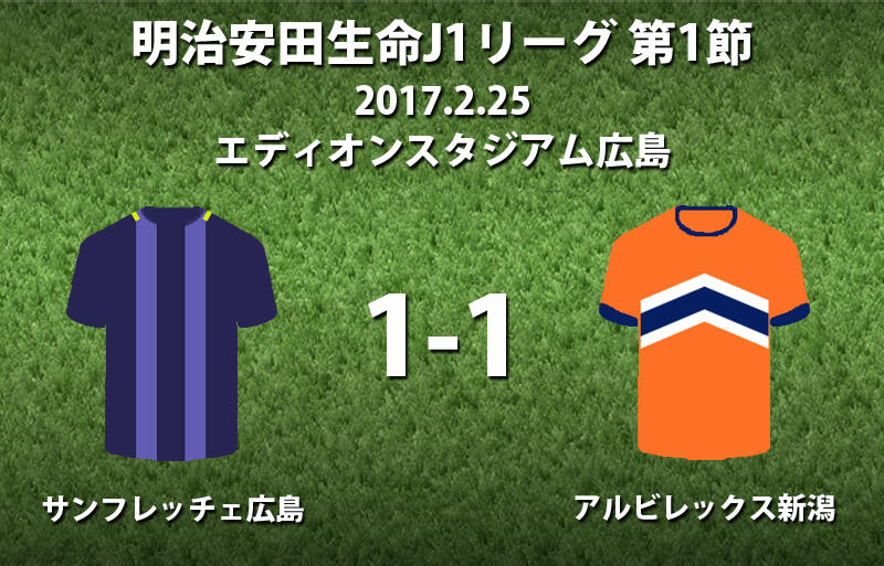 ▽25日にエディオンスタジアム広島で行われた明治安田生命J1リーグ開幕節のサンフレッチェ広島vsアルビレックス新潟は、1-1のドローに終わった。