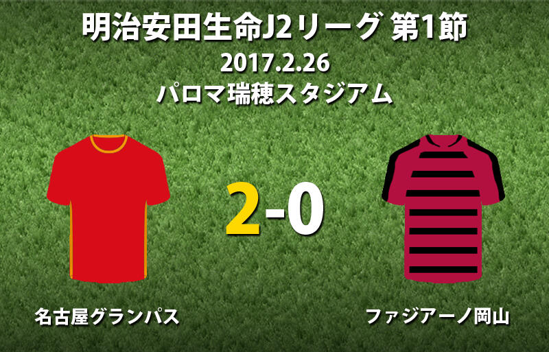 ▽26日にパロマ瑞穂スタジアムで行われた明治安田生命J2リーグ開幕節の名古屋グランパスvsファジアーノ岡山は、ホームの名古屋が2-0で勝利した。