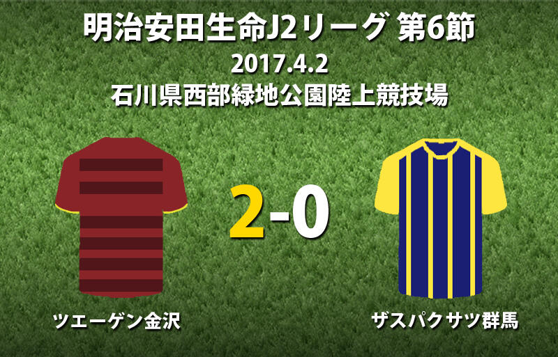 ▽明治安田生命J2リーグ第6節のツエーゲン金沢vsザスパクサツ群馬が2日に石川県西部緑地公園陸上競技場で行われ、2-0で金沢が勝利した。