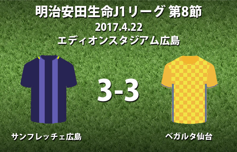 ▽22日に明治安田生命J1リーグ第8節のサンフレッチェ広島vsベガルタ仙台がエディオンスタジアム広島で行われ、3-3の引き分けに終わった。