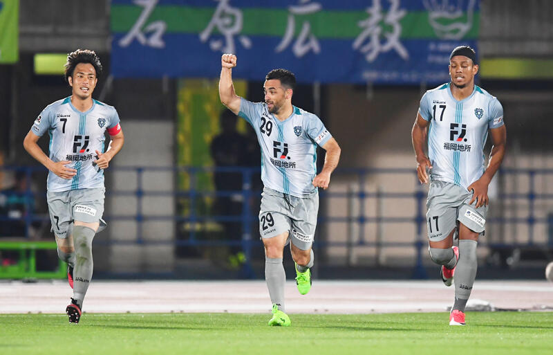 ▽それでも、福岡は87分に右サイド深くから駒野が入れたクロスに正面で合わせた城後がヘディングシュートをゴール左に決めて3点目。そのまま首位チームを完封した福岡がリーグ3連勝を飾り、勝ち点で湘南に並んだ。