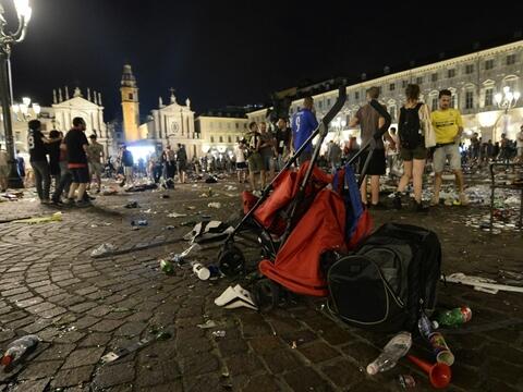パブリックビューイングが行われたトリノ中心部のサン・カルロ広場には、約2万人のユベントスファンが訪れていた。突如鳴り響いた爆音に、「テロが起きた」と勘違いした人々が一斉に逃げ回り、将棋倒しとなるなどして多くの被害が出た。またビンの持ち込みが禁止されておらず、割れた破片により被害が拡大した。