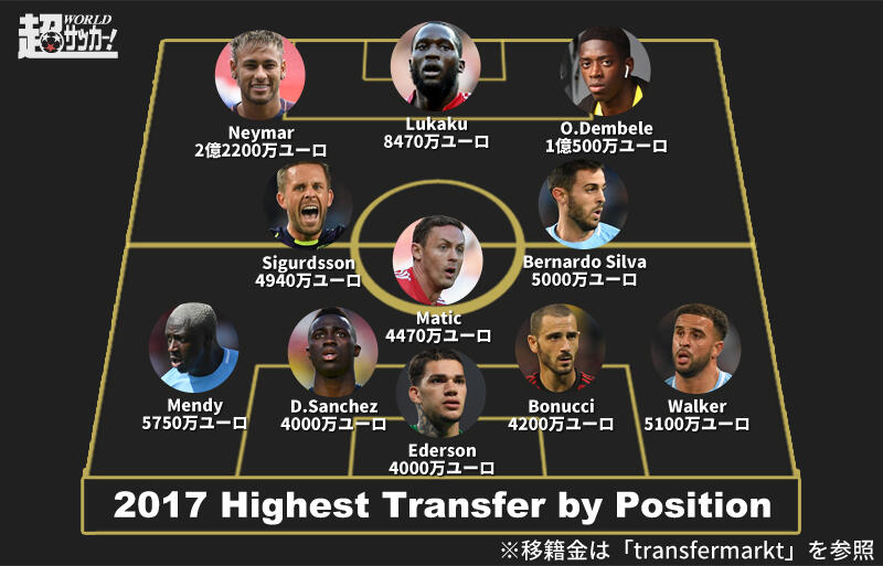 ▽ポジション別では、GKはマンチェスター・シティがベンフィカから獲得したGKエデルソンで、4000万ユーロ(約52億円)。DFでは、同ポジションで歴代最高額となったマンチェスター・シティがモナコから5750万ユーロ(約75億円)で獲得したDFバンジャマン・メンディだ。MFでは、同じくシティがモナコから獲得したMFベルナルド・シルバの5000万ユーロ(約65億円)となっている。