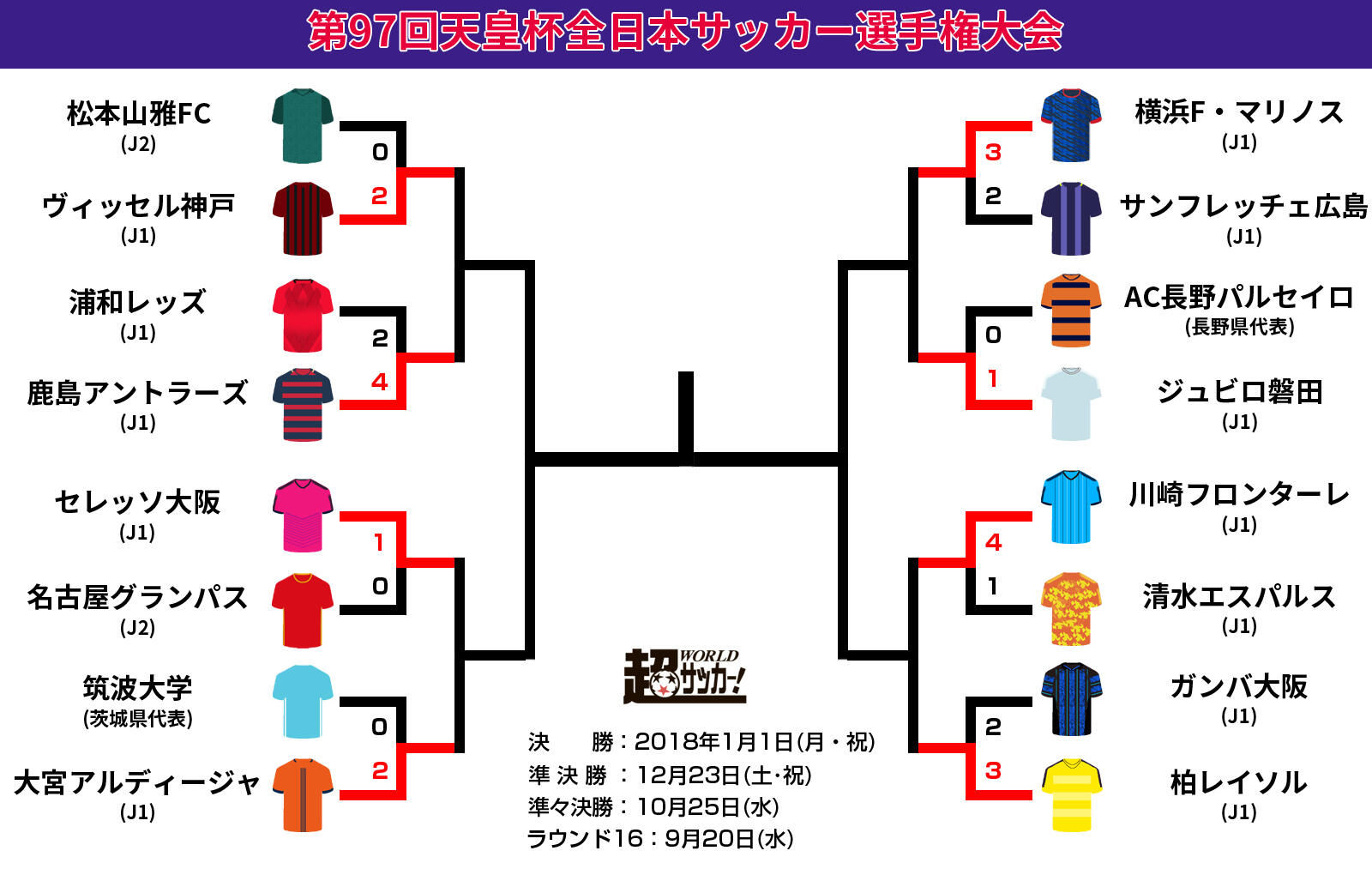 ▽前回大会王者の鹿島アントラーズは、浦和レッズと対戦し2-4で勝利。MF金崎夢生の2得点でリードするも、浦和のFWズラタン、FW武藤雄樹のゴールで追いつかれる展開となった。しかし、MF中村充孝のゴールで勝ち越すと、MF土居聖真がダメ押しゴールを決め、ベスト8に進出した。