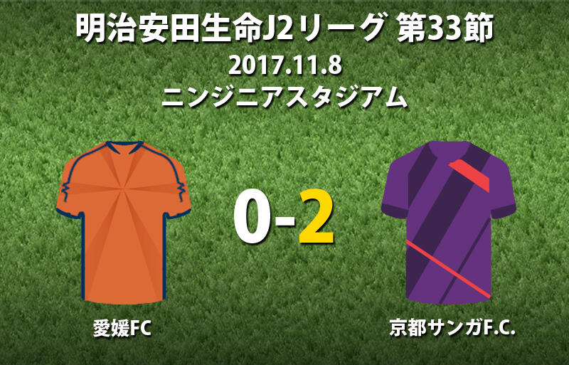 ▽8日にニンジニアスタジアムで行われた明治安田生命J2リーグ第33節延期分の愛媛FCvs京都サンガF.C.は、アウェイの京都が2-0で勝利した。