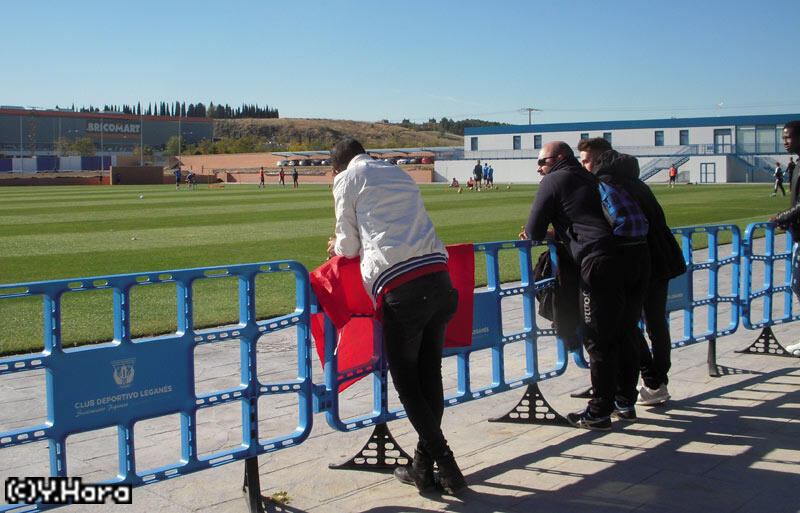 ▽そして話をリーガに戻すと、実は今週は天気も良かったため、マドリッドのチームの練習見学にせっせと足を運んでいた私だったんですけどね。まずは火曜、今節はバルサをホームのブタルケに迎えるとあって、兄貴分の期待を一身に背負っているレガネスを偵察。ロッカールームやジムなどがある新しいクラブハウス前にオープンしたインスタラシオン・デポルティボ・ブタルケの新グラウンドは、以前のように四方から丸見えでは訳ではないものの、ファン見学用のスペースもちゃんと用意されていました。丁度、モロッコがW杯出場を決めた後だったのもあって、国旗を持ってアムラバットの応援に来ていた男性などもいましたが、ちょっと厄介なのはまだ施設で工事が続いているせいで、よく出入り口が変わることでしょうか。