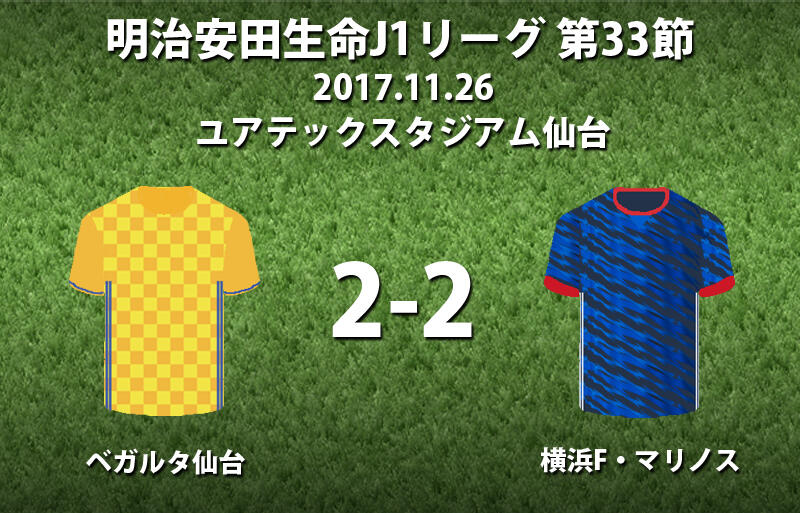 ▽26日に明治安田生命J1リーグ第33節のベガルタ仙台vs横浜F・マリノスがユアテックスタジアムで行われ、2-2のドローに終わった。