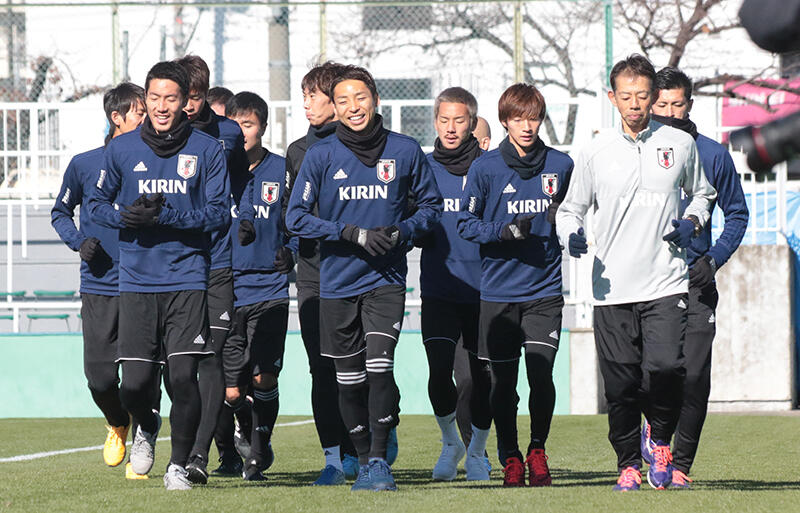 ▽メンバーたちは練習開始予定時刻から15分遅れてピッチに登場。昨日の中国戦で負傷したMF大島僚太(川崎フロンターレ)とMF伊東純也(柏レイソル)の姿はなく、大島は検査、伊東は宿舎で別調整となった。2人を除いたメンバー一同は青空ミーティングの後、中国戦の先発組と控え組に分かれてトレーニングへと移行した。控え組にはこれまで別メニュー調整が続いていたDF車屋紳太郎(川崎フロンターレ)も混ざり、全体練習に復帰した。