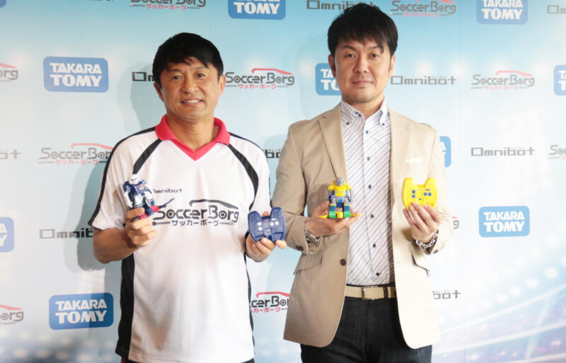 ▽11日、株式会社タカラトミーが本格的なサッカー対戦ができる、次世代RCサッカーロボット「サッカーボーグ」の発表会を開催。元日本代表FW武田修宏氏とサッカー好きタレントとして知られる土田晃之氏が出席した。イベント終了後、武田氏と土田氏が記者団の取材に応じた。
