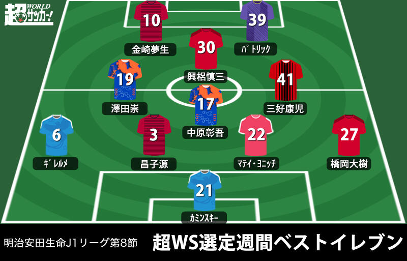 ▽明治安田生命J1リーグ第8節の9試合が14日から15日にかけて開催された。超WS編集部が今節の各試合で印象に残った選手の中からベストイレブンを紹介する。