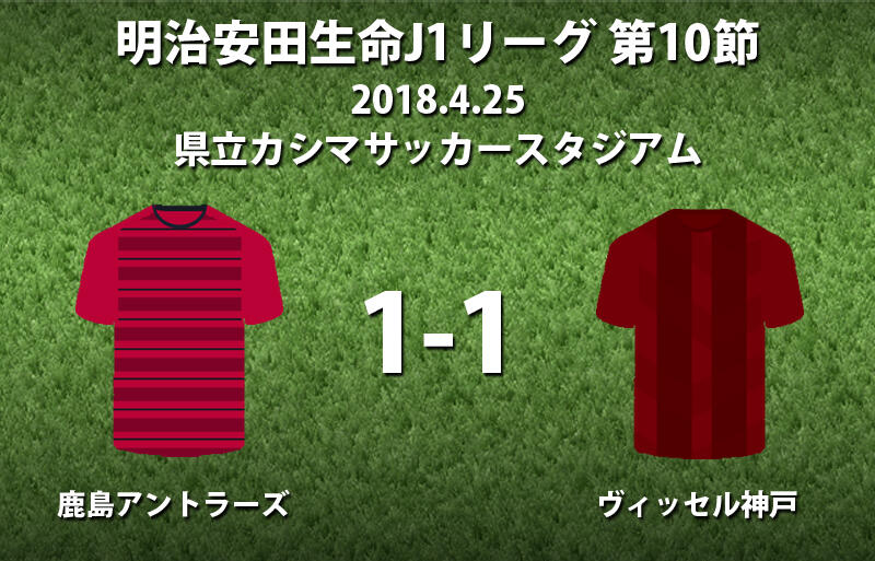 ▽25日、明治安田生命J1リーグ第10節の鹿島アントラーズvsヴィッセル神戸が県立カシマサッカースタジアムで行われ、1-1のドローに終わった。