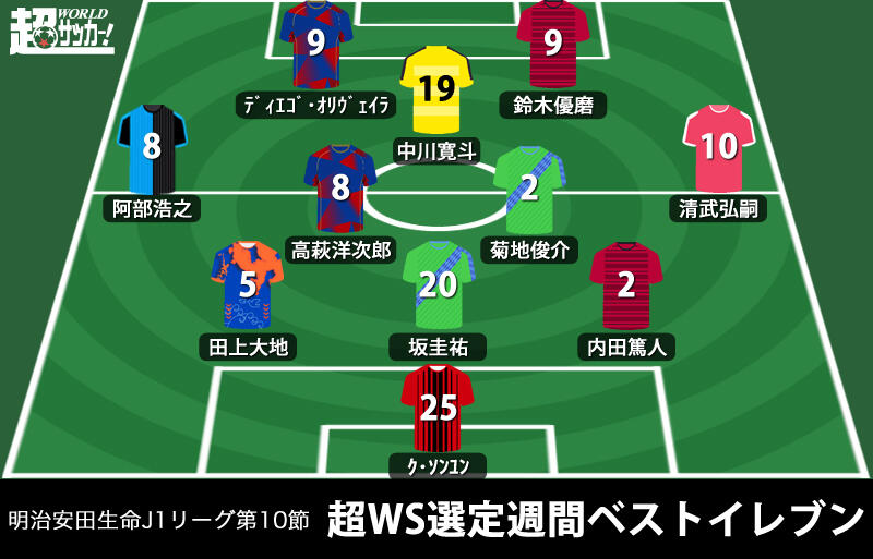 ▽明治安田生命J1リーグ第10節の9試合が25日に開催された。超WS編集部が今節の各試合で印象に残った選手の中からベストイレブンを紹介する。