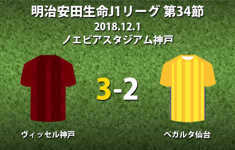 ▽明治安田生命J1リーグ第34節のヴィッセル神戸vsベガルタ仙台が12月1日にノエビアスタジアム神戸で行われ、ホームの神戸が3-2で勝利した。