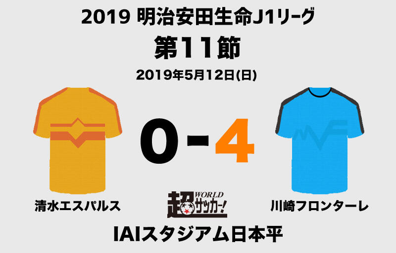12日にIAIスタジアム日本平で行われた明治安田生命J1リーグ第11節の清水エスパルスvs川崎フロンターレは、アウェイの川崎Fが4-0で勝利した。