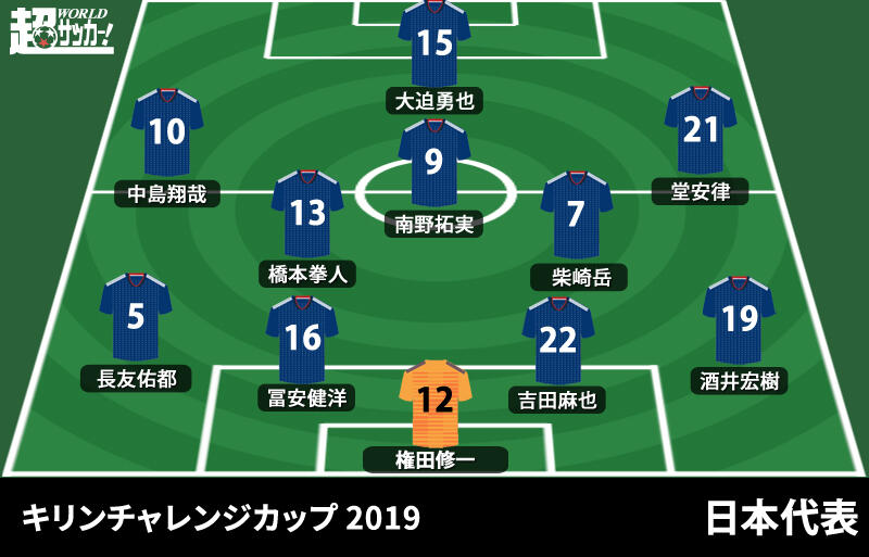 森保一監督は前日会見で公言した通り、4バックシステムを採用する見込み。GKには権田修一、ダブルボランチではMF柴崎岳の相方にMF橋本拳人が抜擢。二列目にはMF堂安律、MF南野拓実、MF中島翔哉が並んだ。MF久保建英はベンチスタートとなっている。