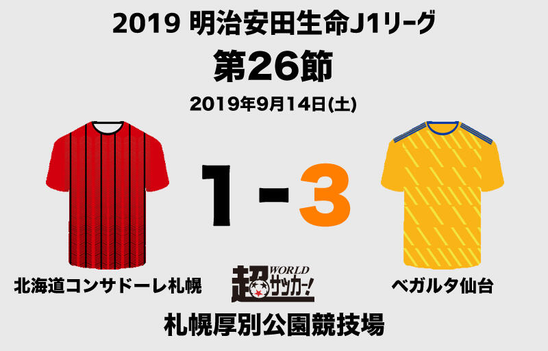 14日に札幌厚別公園競技場で行われた明治安田生命J1リーグ第26節の北海道コンサドーレ札幌(7位/勝ち点39)vsベガルタ仙台(15位/同28)は、アウェイの仙台が3-1で勝利した。