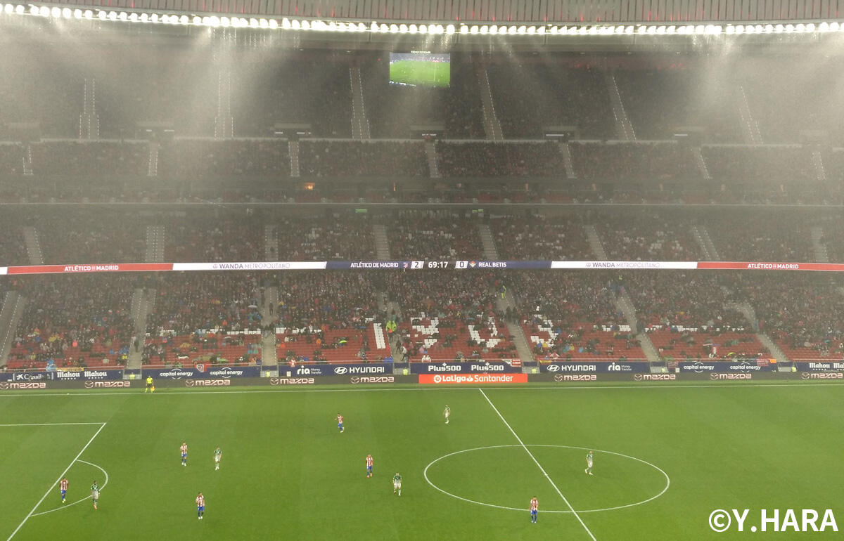 そして翌日曜にはアトレティコがワンダ・メトロポリターノにベティスを迎えたんですが、これが大雨の中の試合となってねえ。昔、ビセンテ・カルデロンでプレーしていた時には、記者席に屋根はあっても雨漏りや横から吹きつける水滴が気になったものですが、ワンダではスタンド最前列にでもいない限り、全然平気。前節レバンテ戦での退席処分で1試合のベンチ入り禁止となり、パルコ(貴賓席)観戦していたシメオネ監督同様、私も快適に過ごすことができたんですが、もしやキックオフ時にはすでにズブ濡れになっていたのと、早々にカルバーリョの強烈シュートをGKオブラクが弾いてくれたのが、最近は眠ったまま、ピッチに立つことが多かったアトレティコの選手たちの目を覚ましてくれた?