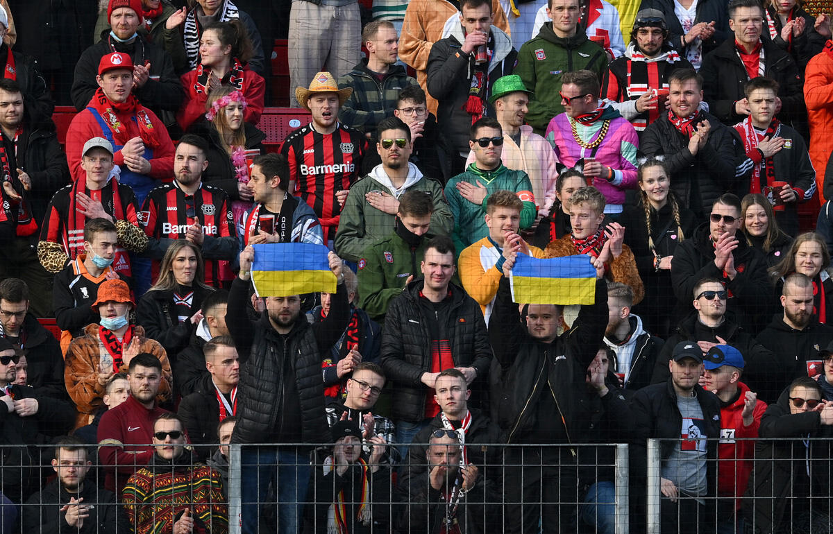 グロイター・フュルトvsケルンでは青と黄色の「STOP WAR - WIR GEGEN KRIEG」の横断幕が掲げられ、原口元気や遠藤渓太を擁するウニオン・ベルリンもマインツ戦のキックオフ前に黙とうをささげた。