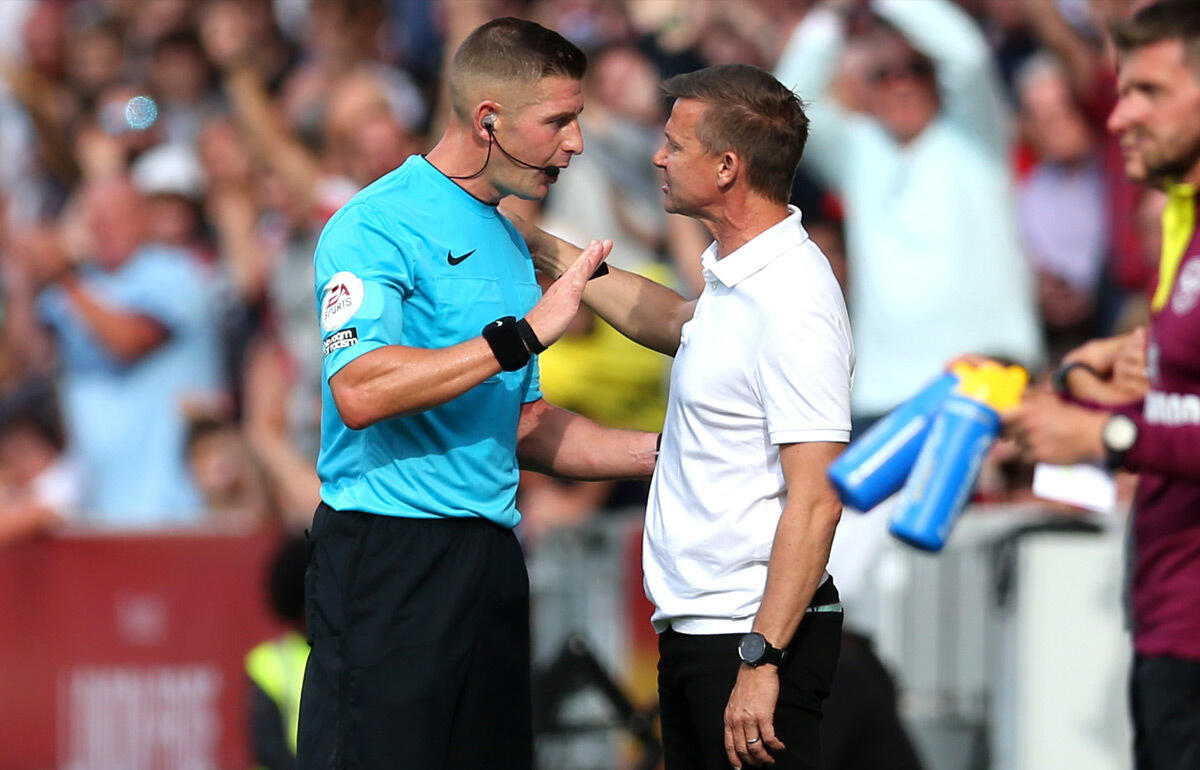 ブレントフォードのアーロン・ヒッキーが、リーズのクリセンシオ・サマーフィルに対して激しいタックル。マーシュ監督はPKが与えられなかったことに激怒した。