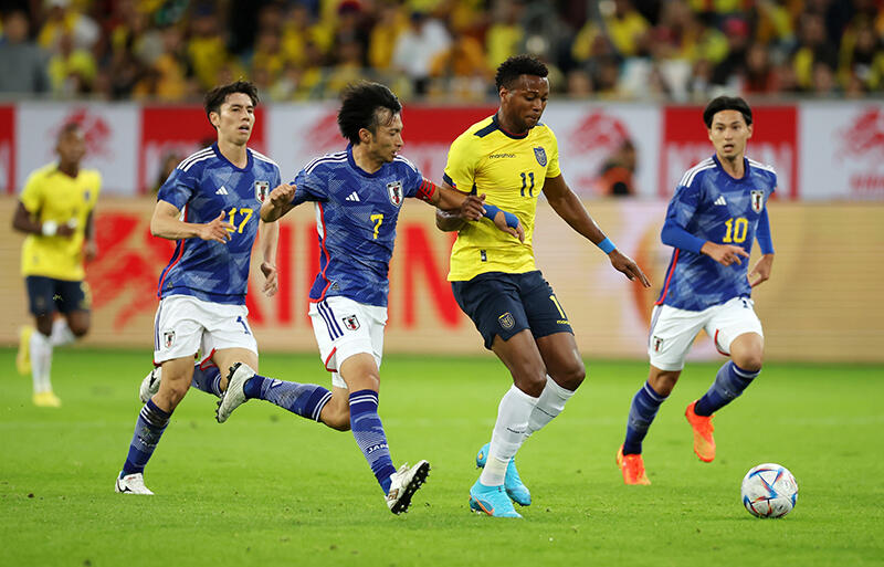 相手は熾烈な南米予選を4位で勝ち抜いた強豪エクアドル。確かなボール技術と俊敏性を武器に立ち上がりから日本のゴールに迫る。対する日本は、左ウイングに入った三笘が得意のドリブルで存在感を放つ。爆発的なスピードで対応するカスティージョのイエローカードを誘うと、7分には南野のヘディングシュートをアシスト。