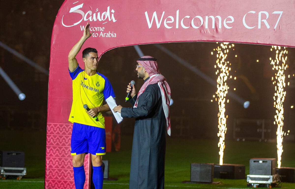 盛大なセレモニーでスーパースターを迎え入れたアル・ナスルのサポーター。チームのユニフォームを着用したC・ロナウドは終始笑顔だった。