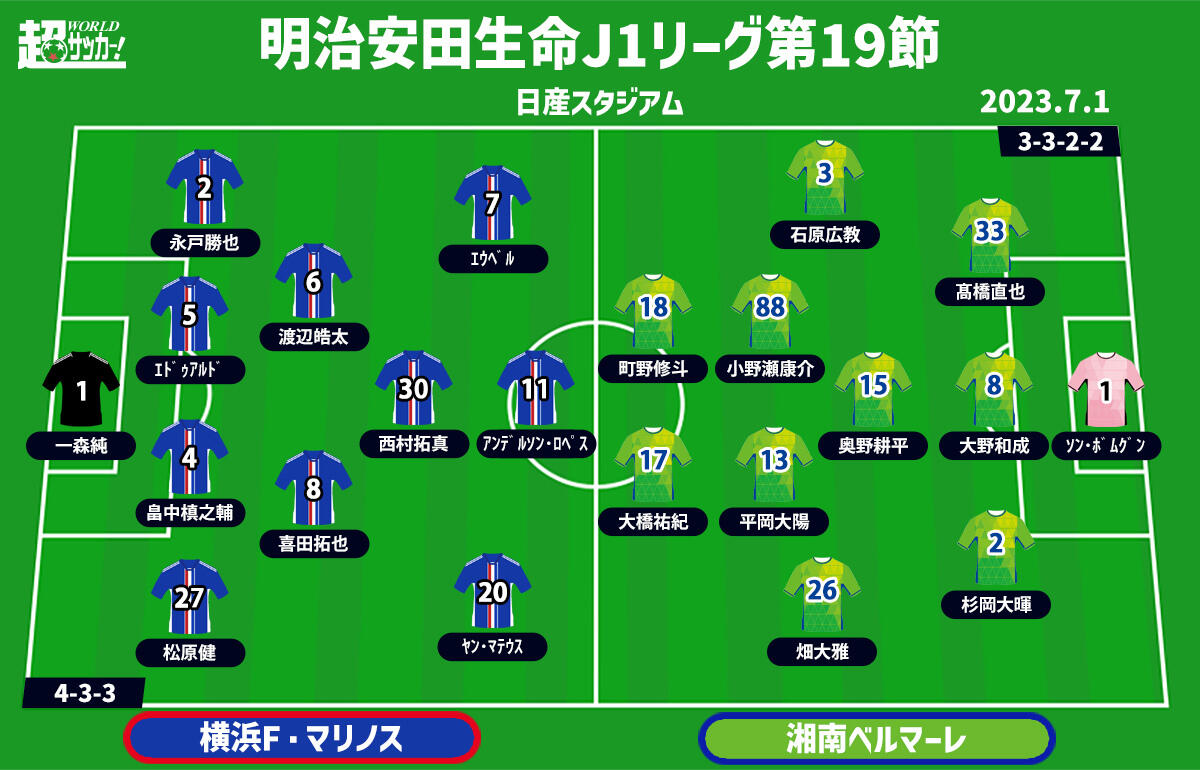 横浜F・マリノス(1位/39pt) vs 湘南ベルマーレ(18位/12pt)
