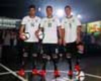 ▽ドイツサッカー協会(DFB)は9日、ベルリンでユーロ2016に臨むドイツ代表の新ユニフォーム発表会を行った。イベントにはガラタサライのFWルーカス・ポドルスキをはじめ、リバプールのMFエムレ・カン、ケルンのMFヨナス・ヘクターが参加。さらに、パンダの覆面をかぶったドイツ人ラッパーのCroが登場し、会場を盛り上げた。