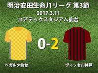 ▽明治安田生命J1リーグ第3節のベガルタ仙台vsヴィッセル神戸が11日にユアテックスタジアム仙台で行われ、0-2で神戸が勝利した。